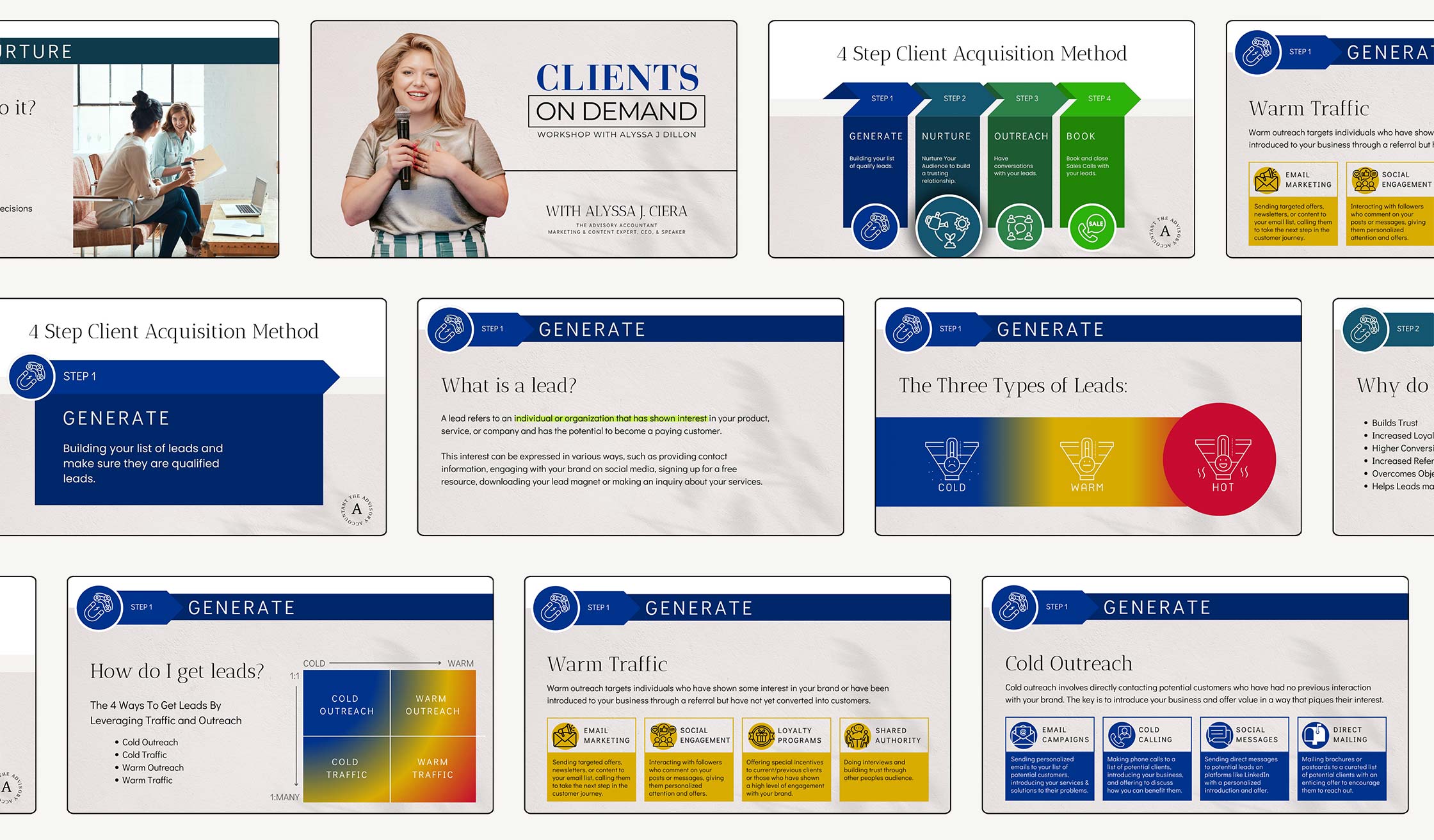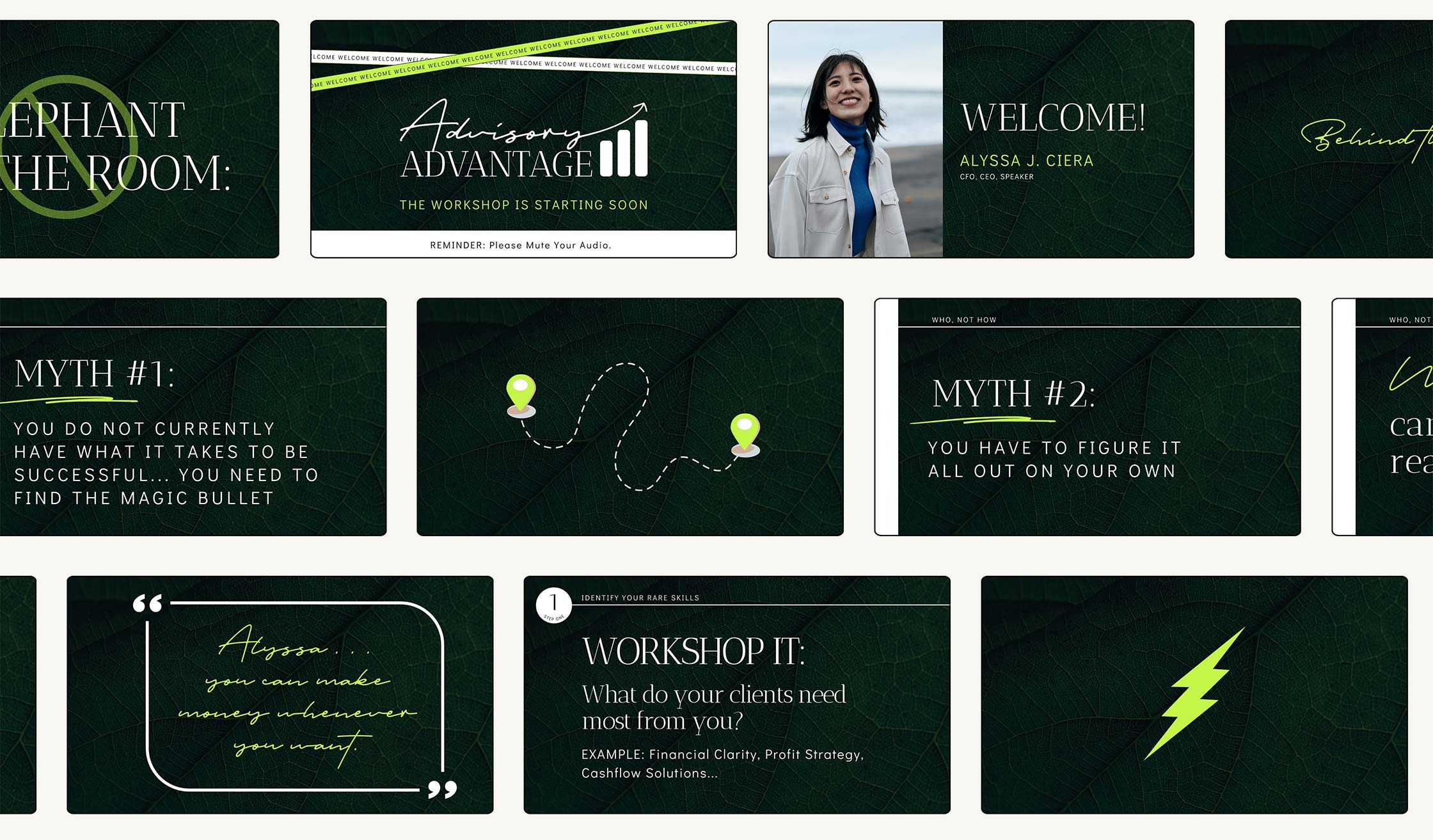 Workshop and sales decks for a finance services brand. I created a repeatable deck system with speaker notes and visual rhythm for live instruction.