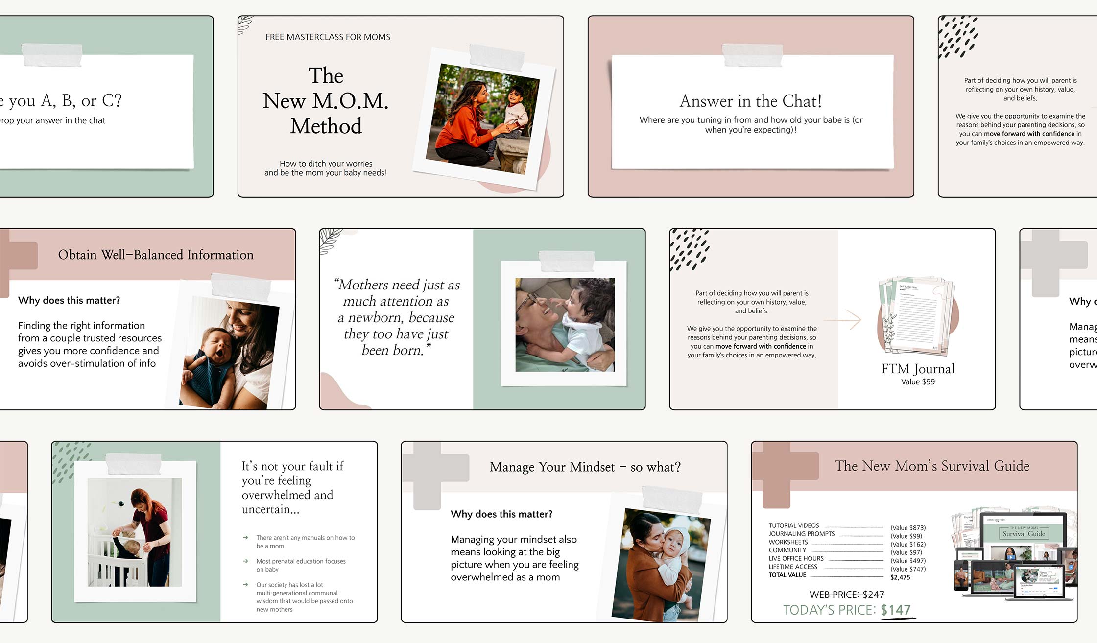 Course launch and webinar decks for a parenting education brand. I paired friendly visuals with a clean structure that supports clear teaching.