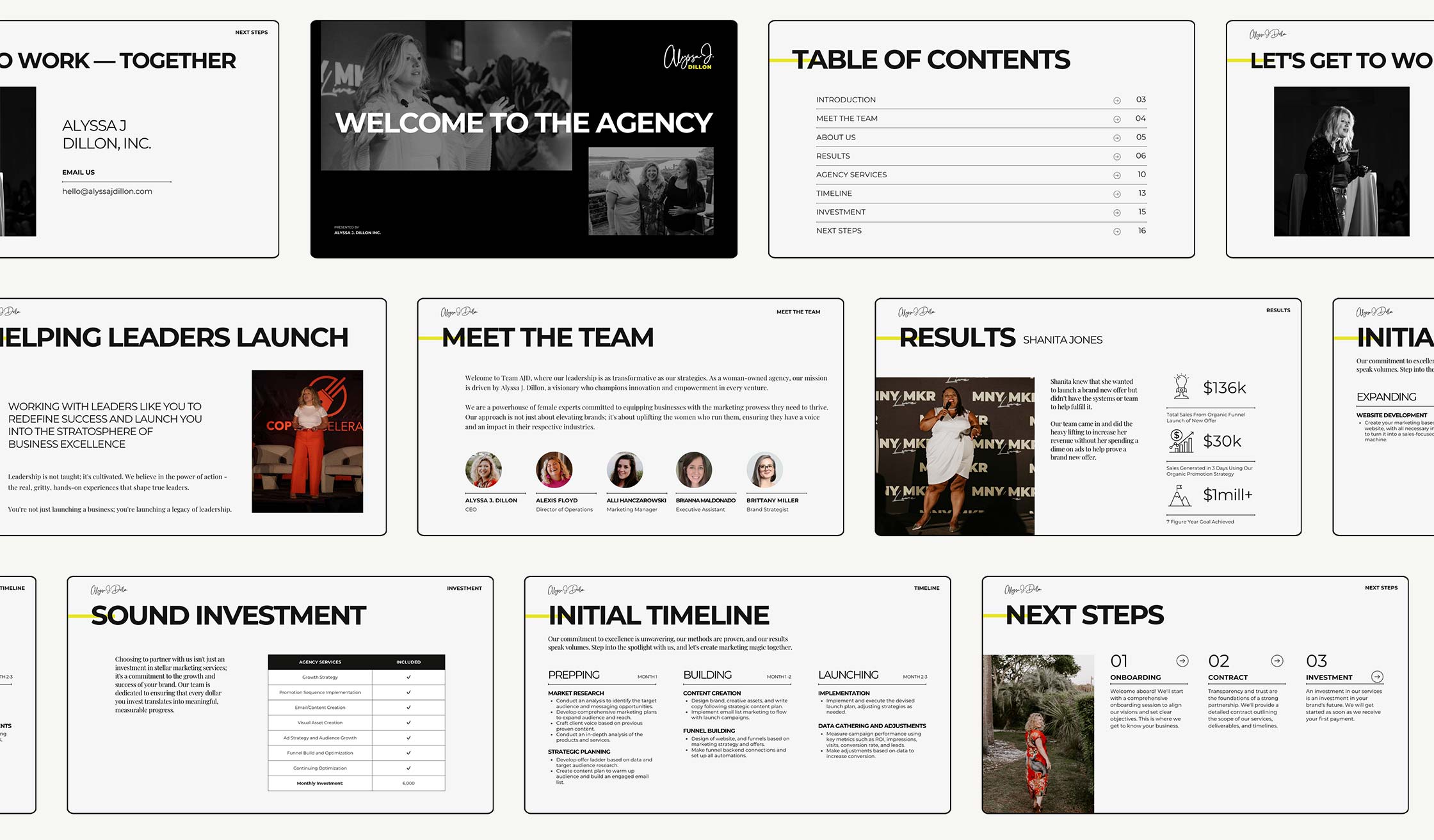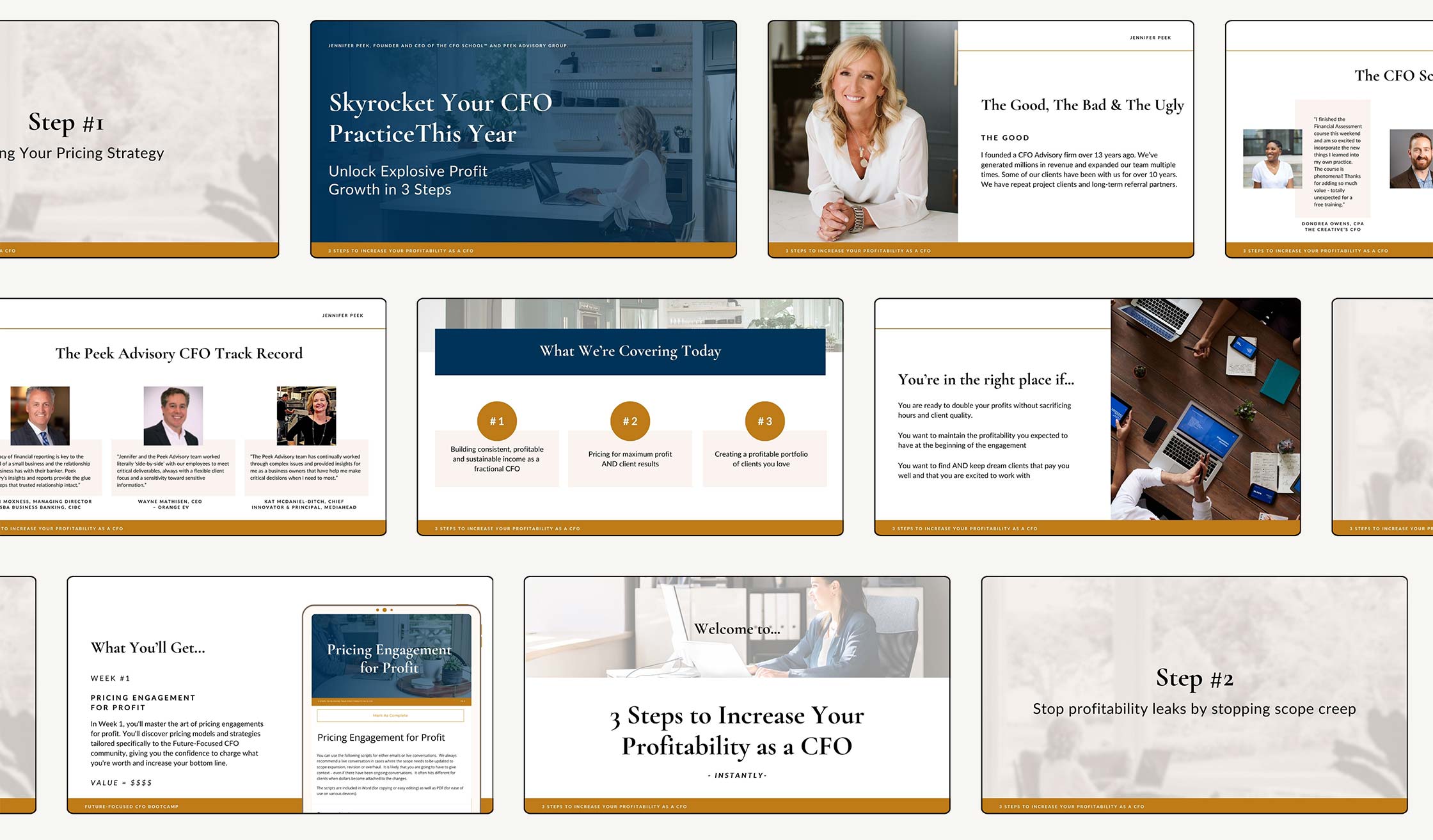 Executive pitch and program decks for a consulting practice. I aligned visual language with the brand and built a template suite for the team.